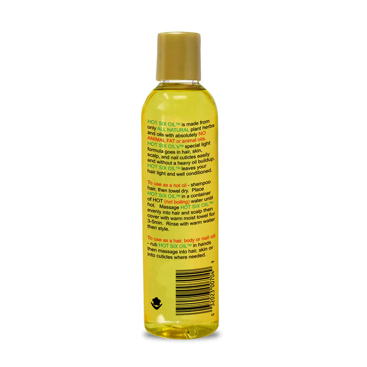 HOT SIX OIL is made from only ALL NATURAL plant herbs and oils with absolutely NO ANIMAL FAT or animal oils. HOT SIX OIL's™ special light formula goes in hair, skin, scalp, and nail cuticles easily and without a heavy oil buildup. HOT SIX OIL™ leaves your hair light and well conditioned.